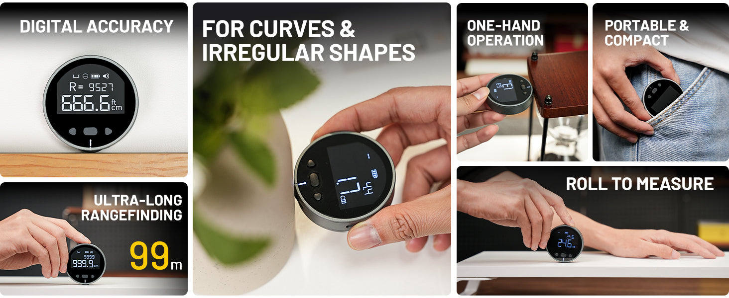 MiniQ is a pocket-sized versatile electronic tape measure with a maximum measuring distance of 99.9 meters (accumulation). With multiple modes, it measures flat, curved, circular, and irregular surfaces with ease. At just 35g, it’s lightweight and portable—perfect for quick, accurate measurements anytime. Ideal for DIY, sewing, crafts, interior design, and more.