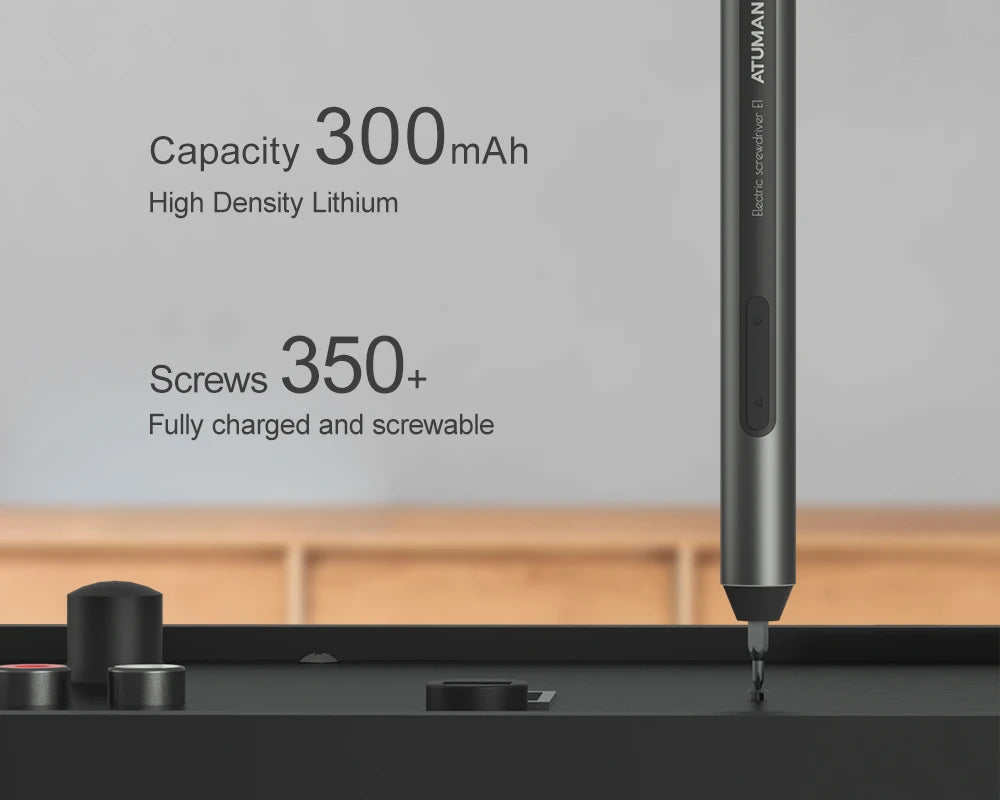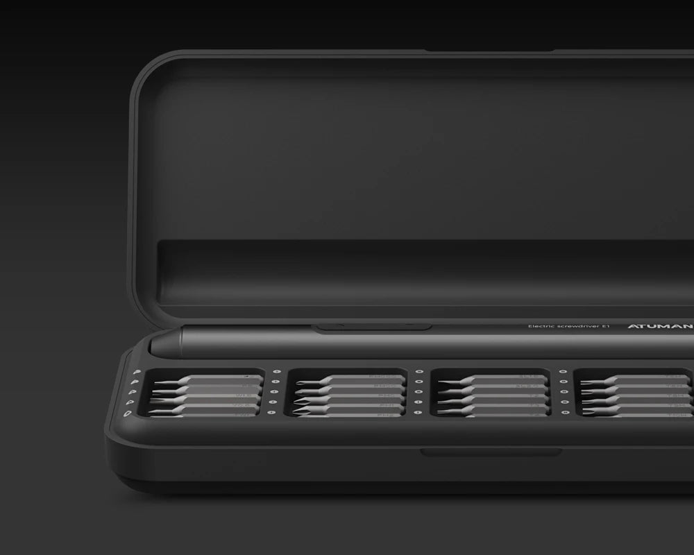 The ATuMan E1 Electric Screwdriver Set is a precision tool designed for electronics, gadgets, and home repairs. Featuring dual-speed adjustment, accurate torque control, and a rechargeable battery, it delivers smooth and efficient operation for delicate tasks. With 25 precision bits and a compact ergonomic design, the E1 is ideal for repairing phones, laptops, cameras, watches, and other small devices.